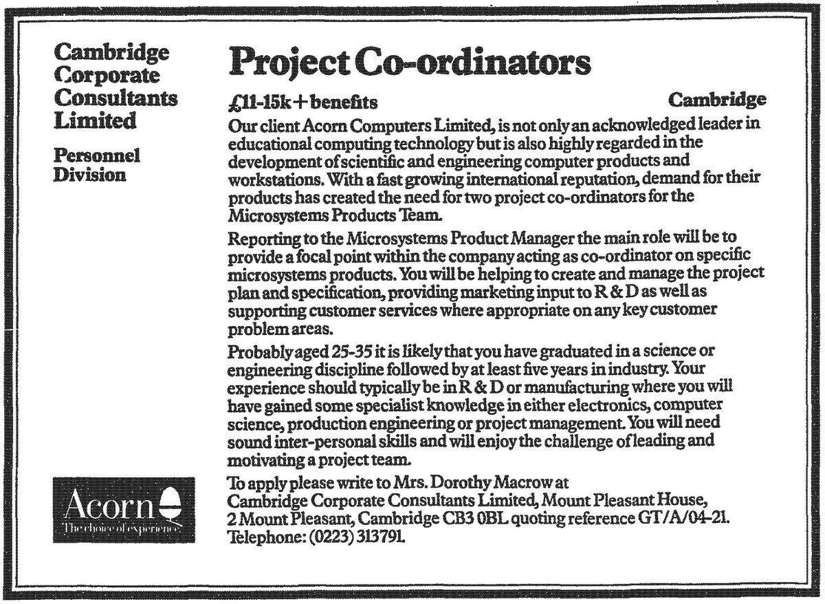 This is a collection of job adverts from major UK publications for Acorn Computers. Due to the nature of the scanning the quality may not be the highest, and print from the oposite page may show through.